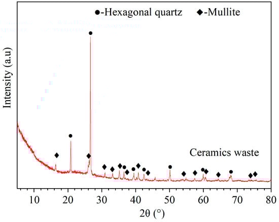 - The ceramic waste used is composed of a high content of SiO2 and Al2O3 in chemical composition, as well as 65% silicate glass and other crystalline quartz and mullite in phase composition. These basic characteristics of high-temperature sintered ceramic waste endow the obtained aggregates with good mechanical properties and high density.