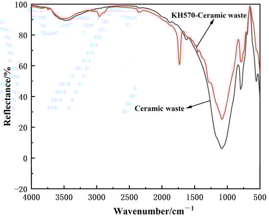 Figure 4 shows the FTIR spectra of the ceramic waste raw materials before and after modification by silane coupling agent KH-570. The spectra before and after modification are consistent, indicating that the compositions are the same, but the structure of their surface groups changes significantly. The broad peak at 3526 cm−1 on the sample surface before modification is the antisymmetric stretching vibration peak of structural water OH; the strong and wide absorption band at 1078 cm−1 is the antisymmetric stretching vibration peak of SiO2 in the ceramic waste; the symmetric stretching vibration peak of the Si–O bond is at 793 cm−1; the bending vibration peak of the Si–O bond is at 462 cm−1. A comparison of the spectrograms before and after the modification of ceramic waste raw materials reveals that stretching vibration absorption peaks of CH3 and CH2 in KH-570 are present near 2956 cm−1 and 2877 cm−1 in the modified samples, and that of the C=O bond is at 1731 cm−1, indicating that organic substances exist on the surface of the modified ceramic waste particles. That is, after the hydrolysis of the three methoxy functional groups of the silane coupling agent, it reacted with –OH on the surface of waste ceramic particles for dehydration; therefore, the ceramic waste particles can be chemically grafted and bonded with KH-570. Thus, the modification of the silane coupling agent improves the bonding strength between inorganic particles and resin, which is helpful for improving the mechanical strength of the artificial stone.