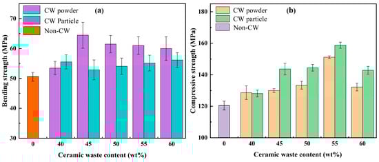 - The application of 40–60% ceramic waste instead of quartz sand can improve the bending strength and compressive strength of artificial stones to varying degrees. The highest bending strength of 64.4 MPa was achieved when 45% of ceramic waste powders (particle size ≥ 120 mesh) were added; the highest compressive strength of 158.7 MPa was attained when 55% of different graded ceramic waste particles were added; these values are 27% and 32% higher than when only quartz sand was used as aggregate particles.