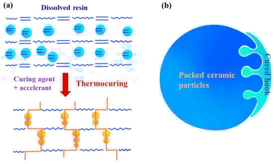 Schematic diagrams of (a) resin crosslinking and curing and (b) the interlocking effect between pores of packed particles and cured resin hooks.