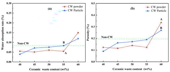 (a) Water absorption rate and (b) porosity of artificial stones with different ceramic waste additions.