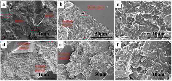 Figure 8 shows the cross-sectional SEM photographs of the samples from Group A and Group B with 45% addition of ceramic waste. It is seen that the ceramic waste artificial stones prepared by using o-phenyl unsaturated resin as the curing binding agent have a very dense microstructure in general. In Figure 8a, it is found that the fine particles of ceramic waste fully filled space between larger-sized quartz particles, forming a highly dense microstructure, and no obvious porosity is observed. This is consistent with the results of porosity analysis shown in Figure 7b. Figure 8b shows the tight interfacial bonding between the larger quartz particles and the smaller ceramic waste particle accumulations. The higher magnification SEM photograph shown in Figure 8c further reveals that the fine particles of ceramic waste distributed among the large quartz particles form a homogeneous and dense accumulation structure by themselves. It is this ideal microstructure that gives the highest bending strength to the A2 artificial stone samples prepared from the fine ceramic waste powders. It is observed in Figure 8d that B2 samples prepared from ceramic waste particles with relatively large particle sizes also have a relatively dense microstructure in general. However, by comparing Figure 8b,c,e,f, it is seen that the cross-section of B2 samples is relatively rough, the homogeneity of the microstructures is reduced, and a small number of small holes were generated between large irregular particles. Although high-strength vacuum vibration compression molding was adopted, these small holes were difficult to completely eliminate due to the irregular shape of large waste ceramic particles and the low fluidity of resin, which cause its bending strength to be lower than A2 samples.