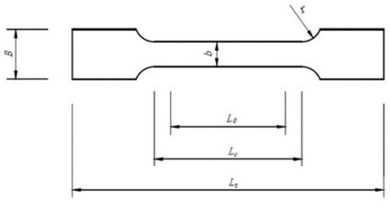 Uniaxial tensile tests were conducted to characterize the mechanical properties of 8 mm and 12 mm Q355 steel. The specimen size was determined by considering the clamping end of the test equipment and the extension gauge distance following the relevant provisions of the national standard GB/T2281-2010 [31]. The section size of the specimen is shown in Figure 2 and Table 1.