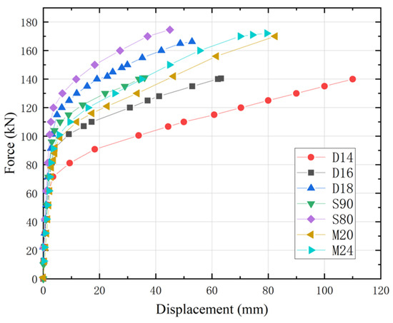 Taking M20 as an example, Type-1 damage occurs. The flange plates of T-shaped pieces were in close contact at the beginning of loading. Due to the increased load, there was a gap between the flange plates, and bending deformation occurred to the bolt rod. A plastic hinge or seam toe crack appears when the connection between the flange plate and the web fails. In specimen D16, a Type-2 failure occurred. The upper and lower flange plates of the T-shaped piece are in close contact during initial loading. When the load increases, the flange plates bend, and the gap widens rapidly. Plastic hinge or weld toe cracks appear between the flange plate and web at the time of failure, and the bolt is broken.