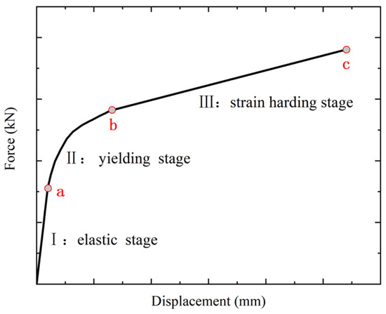 where and represent the ultimate load and ultimate displacement of T-stubs, respectively. denotes the force corresponding to the initiation position of the strain-hardening stage on the force–displacement curve.