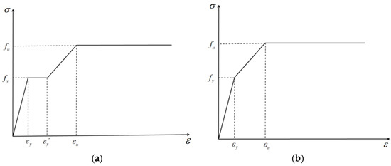 The SOLID45 elements were used to simulate the T-stubs. In this study, the materials were considered to be isotropic and assumed to be an ideal four- or three-linear elastoplastic model. Figure 11a illustrates the stress–strain relationship of Q355 steel as a four-line follow-up strengthening model, whereas Figure 11b illustrates the stress–strain relationship of 10.9 high-strength bolt as a three-line follow-up strengthening model. The value of material parameters of Q355 steel is based on the tensile test results of Q355 steel in Section 2.1, as shown in Table 6. According to the product quality guarantee, the material parameters for 10.9 s high-strength bolt were set as shown in Table 7. Furthermore, Poisson’s ratio was 0.3, and the von Mises yield criterion was applied.