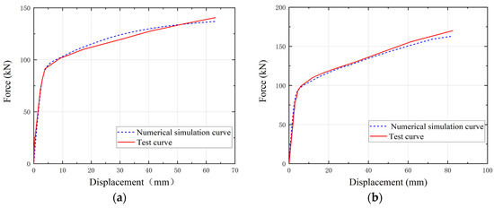 Comparison of the test curve and the numerical simulation curve. (a) Specimen D16, (b) Specimen M20.