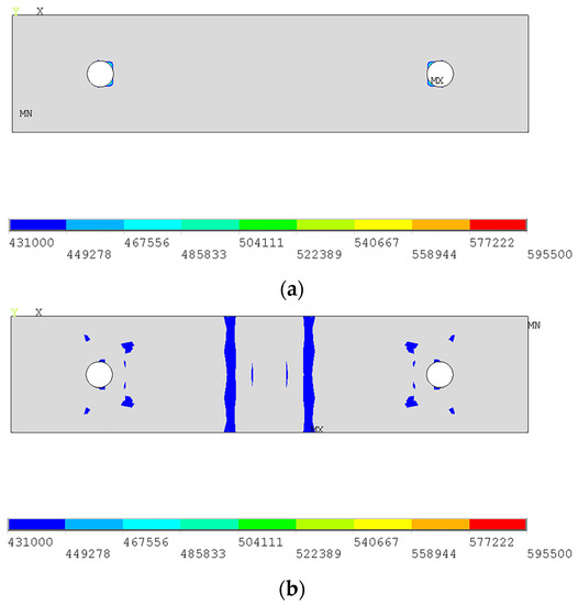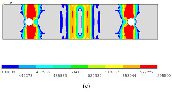 Based on the numerical simulation results, it is evident that the stress distribution of T-stubs exhibits three key states. In the first state, the area around the screw hole yields, as shown in Figure 14a. With increasing load, the second state occurs: the joint between the flange plate and web yields, and the yield area is connected along the width of the flange plate, as shown in Figure 14b. The third state is the limit state. Flange plates have obvious plastic deformations. The material at the connection part between the flange plate and web and the area around the bolt hole has yielded and reached the ultimate tensile strength, as shown in Figure 14c. The critical states of the above three stress distributions correspond to points a, b, and c on the force–displacement curve shown in Figure 9.
