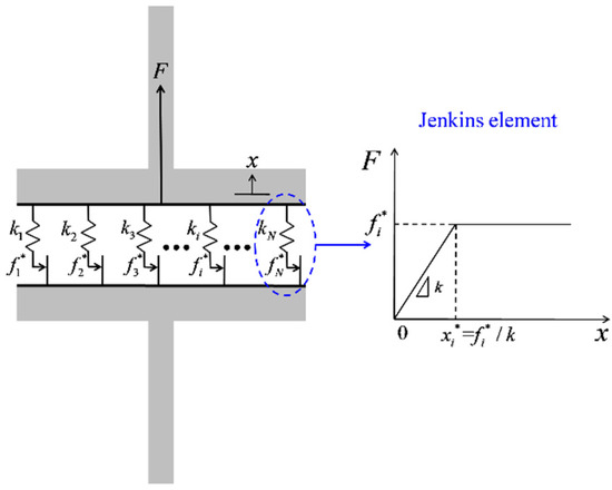 Based on the behavior characteristics of T-stubs under tension, the Iwan model [33] is adopted to establish the mechanical model of T-stubs. The model is composed of a series of Jenkins elements connected in parallel, and each Jenkins element is formed of a spring and a slider in succession, as shown in Figure 15. The force of each Jenkins element can be expressed as follows [33]: