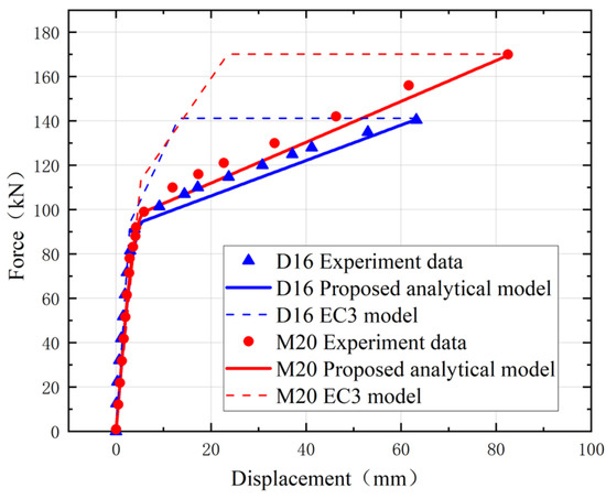 Table 8 shows the results of the parameter identification method used on specimens D16 and M20. The comparisons of the force–displacement curves for D16 and M20 T-stubs obtained from the proposed analytical model and EC3 model with the test results are shown in Figure 18.