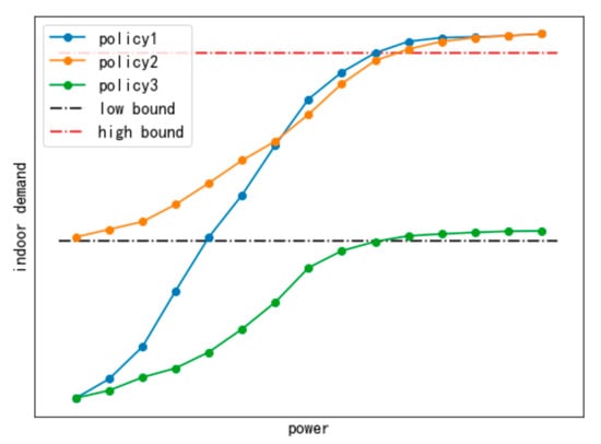 As show in policy 1 in Figure 2, when the system is controlled at low power, it cannot meet the minimum indoor demand; with the gradual increase in power, the indoor demand is met; when the system is under high power, it may far exceed the indoor demand, resulting in a waste of energy. In some cases, as show in policy 2, low power consumption can meet the indoor demand, so the energy-saving space is large. However, as shown in policy 3, sometimes it is necessary to consume high power to meet the indoor demand, so it will be difficult to save energy consumption.