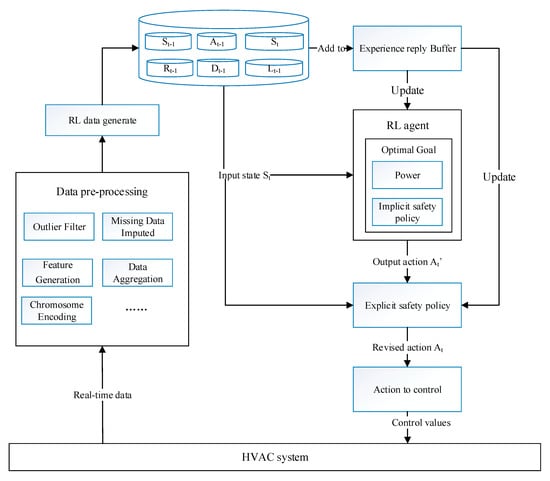 RL with dual safety policies for energy savings in an HVAC system consists of three main modules. They are data pre-processing, RL model and explicit safety policy. The schematic diagram of the proposed algorithm is shown as Figure 3.