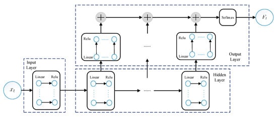 Supposing the network includes hidden layers, the prediction process of a new sample is shown by the blue arrows in the network structure in Figure 4. The details are shown as Equation (10):