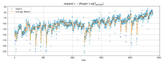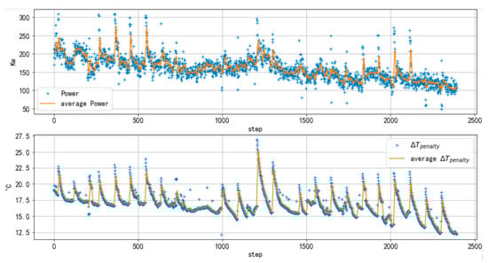 When the system is operated with the proposed control algorithm, the outdoor temperature ranges from 4.10 to 28.00 °C, and the average indoor temperature ranges from 14.90 to 23.91 °C. The reward changing trend is shown in Figure 7, and the power consumption and indoor temperature penalty trends of the proposed RL algorithm are shown in Figure 8.