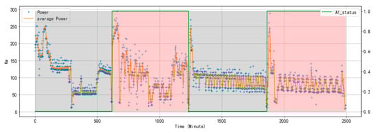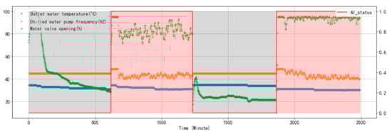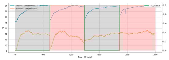 The indoor temperature, outdoor temperature, system power consumption and action values during two AB test phases are shown in Figure 9, Figure 10 and Figure 11. In the figures, left coordinate axes represent the values of temperature, power and actions. The right coordinate axis shows the value of AI_status, which indicates the running status of the AI algorithm. When AI_status is 0, it represents that the HVAC system is under BA control mode (gray shaded area in figures). When AI_status is 1, it means that the HVAC system is controlled by our proposed algorithm (the red shaded area in the figure).