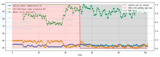 The majority of indoor temperature dissatisfaction during the algorithm occurs when the system is just turned on. As can be seen from Figure 12, the heat pump outlet water temperature, primary chilled water pump frequency, and AHU water valve position are controlled to ensure the indoor temperature rises as quickly as possible when the system is just turned on. Subsequently, there will be no indoor temperature dissatisfaction. When the system is not operated under safety policies, the action is in a larger range. The indoor temperature dissatisfaction lasted for a long time after the system was turned on. Therefore, the safety policies can better safely control, thus reducing indoor temperature dissatisfaction occurrence.