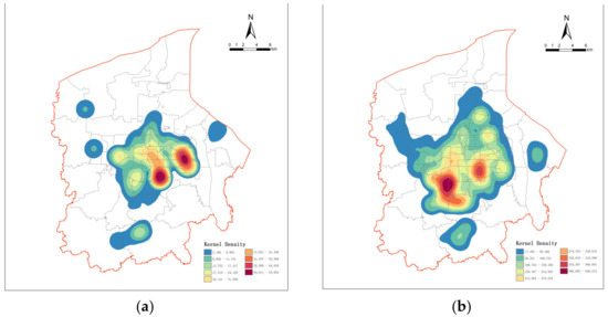 Looking at the different building ages in the datasets, and taking five years as the time period, we divided the data into the following time periods: 1992–1996, 1997–2001, 2002–2006, 2007–2011, 2012–2016, and 2017–2021. Using the kernel density analysis method as shown in Equation (1), the nuclear density of residential building material stock in six time periods was analyzed. Different nuclear density distribution patterns in six time periods showing the spatial agglomeration of residential building stock growth were revealed (Figure 3).