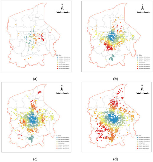 Hot spot analysis is generally used to identify spatial clustering of high value (hot spot) and low value (cold spot), as shown via statistical significance. The calculation method is shown in Equation (2). Based on ArcGIS10.2, the GETIS OrdGi* tool in the mapping cluster toolset, analyzed the hot spots of residential building material stock in six time periods, and its distribution pattern (Figure 4).