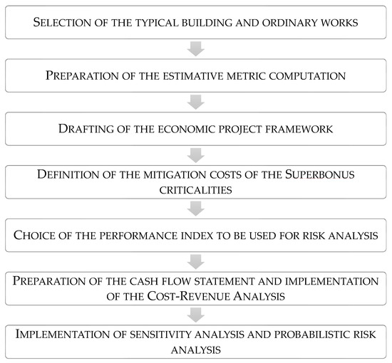 The estimative metric computation is the main document that allows the ex ante monetary quantification of the works to be carried out [23,24,25]. In the case of the Superbonus, according to the Decree of the Ministry of Economic Development of 6 August 2020, a technician must certify that the technical requirements of the intervention comply with those established by the law and the appropriateness of the expenses incurred [26]. At point 13 of Annex A of the aforementioned decree, it is established that it is the responsibility of the technician to assert that the costs by type of intervention are lower than or equal to the average costs of the works carried out as indicated in the Regional or Autonomous Provinces price lists or the guides on the informative prices of the building published by the DEI (Civil Engineering Authority’s Typography). If these price lists do not include the items relating to the interventions, it is possible to determine the new prices analytically. Furthermore, Annex I always establishes the cases in which the asseveration of the technician can be replaced by a declaration from the supplier or installer (an example is the simple replacement of the fixtures). If the costs incurred are greater than the maximum costs indicated by the law about one or more types of intervention, the deduction is applied within the maximum limits identified by the decree [27].