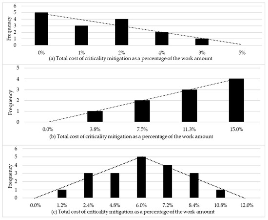 Starting from the last two columns of Table 5, Table 6 and Table 7, it was possible to construct the graphs shown in Figure 2 where, for each of the three groups of projects, it is possible to read the frequency with which a specific total cost of mitigation of criticalities expressed as a percentage of the amount of work occurs.