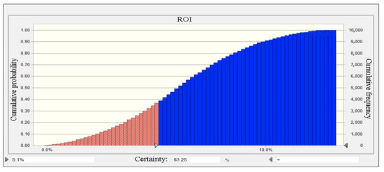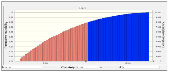 These three criticalities can only be mitigated if one is willing to implement a series of precautionary and protective measures. Measures often have a considerable cost, so the three criticalities can influence the risk of the financial failure of the project. In general, urban planning, technical, and administrative criticalities are mitigated through insurance policies. Alternatively, these critical issues are absorbed by commissioning the verification of the project to high-level professional firms or scientific institutions such as universities. Another way to limit the three critical issues is to purchase the advice of international groups expert in the field (H&D, Ernest & Young, etc.) that perform the function of the General Contractor. Therefore, a good measure of the level of the three criticalities could be represented by the cost of the precautionary and protective actions necessary to mitigate them. When you opt for the invoice discount mechanism, generally the cost of mitigating the recurring criticalities is charged to the company carrying out the interventions (which most often is an Energy Service Company—ESCo). Therefore, in this work, the total cost of the insurance policy, professional consultancy, and the General Contractor is used as a proxy for all the critical issues of an urban planning, technical, and administrative nature found for the project. Starting from the projects analyzed, the probability distribution of this cost was defined, identifying the maximum value, the minimum value, and the most frequent value. The probability of financial failure of the project selected as representative was then estimated as the overall cost of the precautionary and protective measures varies (sensitive variable of the problem). The probability of financial failure is expressed considering the Return on Investment (ROI) as a performance index of the project. Regarding the reasons that led to choosing the ROI as a metric used for risk analysis, we will return to Section 3.5.