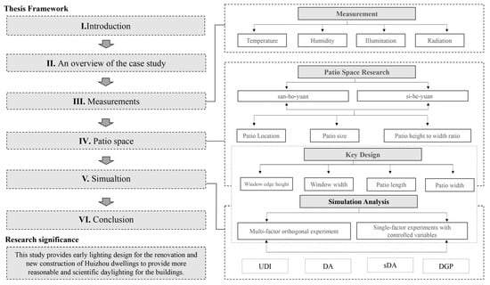 This paper selects Huizhou dwellings as the research object and goal, aiming to use the courtyard space of Huizhou dwellings to provide natural lighting, to improve the indoor light environment by reasonably changing the design parameters of windows. Based on the courtyard space of Huizhou traditional dwellings, the characteristics of traditional courtyard space are summarized and analyzed in combination with the field survey data. On the basis of extracting the basic courtyard space prototype and combining the common design parameters of windows, the key design parameters (window edge height, window width, courtyard length, and courtyard width) of Huizhou traditional dwellings are proposed for a multi-factor orthogonal experiment and a single factor analysis experiment. With the help of the Honeybee plug-in, based on the Radiance engine, the quantitative analysis of the impact of different elements of design parameters on the light environment of indoor space was carried out, aiming to provide a lighting optimization strategy that not only protects the regional space characteristics of Huizhou dwellings, but also conforms to modern scientific norms for the reconstruction and new construction of residential buildings. The framework of this study is shown in Figure 1.