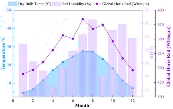 Huizhou has a subtropical monsoon humid climate, characterized by a year-round humid climate, abundant rainfall, four distinct seasons, hot summers, and cold winters. The average annual precipitation is 1800~2000 mm, mainly in spring and summer (from May to August). The rainy season is from the middle of June to the first ten days of July. During this period, the area has rainy days, high temperatures, and humidity. According to the meteorological data collected from the Chinese Standard Weather Data of the Tunxi Meteorological Station [], the annual average temperature here is 16.3 °C, the monthly average temperature in summer (from June to August) is 26 °C, the monthly average relative humidity is 79.7%, the average temperature in winter (from December to January) is 5.7 °C, and the monthly average relative humidity is 78.7%, as shown in Figure 2. The Huizhou region belongs to the fourth category in the light climate division, and the light energy resources are general. There are more sunshine hours in summer and throughout the day, and less sunshine hours in winter. The average sunshine hours in Huizhou are 1732–1970 h, the average sunshine percentage is 42%, and the average annual solar radiation is 110 kcal/cm3, lower than the average total solar radiation in the Anhui Province.
