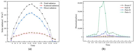 The test time in summer was from 7:00 to 18:30. The illuminance values of Room C, Hall B, and Patio A and B were tested. The test results are shown in Figure 6b. The figure shows that Patio A has the highest illuminance value with a range of 116–41,500 lux, while bedroom C has the lowest illuminance value with a range of 0.1–30.2 lux. The illuminance peaks in the four spaces occurred between 10:30 and 14:00, with the hall and bedroom peaking about half an hour later than the patio space.