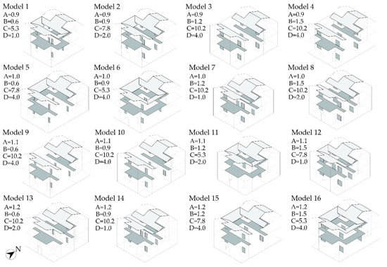The orthogonal experiment table with four design parameters was generated based on the IBM SPSS Statistics 26, and the orthogonal experiment table was used to generate a total of 16 sets of experiments using L16 (44). Since only three values were set for the patio width and patio length, the orthogonal experiment table was modified according to the combined fitted level method, and a total of 16 sets of orthogonal models were obtained (Figure 7) for the simulation.