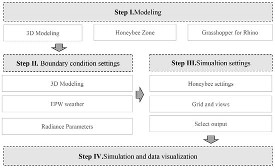 This study uses the plug-ins Ladybug1.5 and Honeybee1.5 in Grasshopper, which are computational daylight simulation plug-ins based on the rhino modeling software developed with the Radiance and Daysim engines, and the simulation flow is shown in Figure 8.