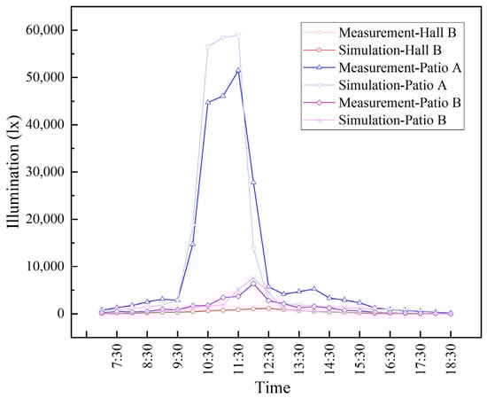 The figure shows that there is a significant difference between the two patios’ highest values of illumination between 10:00 and 12:00. This is because Patio B is surrounded by two-story buildings with subpar daylighting, but Patio A’s front is a one-story building with excellent daylighting. In addition to the building in the real measurement, Patio A also contains green plants and other detritus, and the ground splashing water is more humid, which lowers the reflection coefficient. As a result, the simulated maximum value of Patio A is higher than the measured value. Patio B is further north than Patio A. The maximum value occurs at around 12:00, which is smaller overall than the simulated value but can be used as a validation since the difference is not significant. The illuminance of Hall B is relatively low compared to the two patios. However, the interior furniture is numerous and the reflection is more complicated. The measured curve is not as smooth as the simulated curve, but the trend is similar, thus it can be used as a verification.