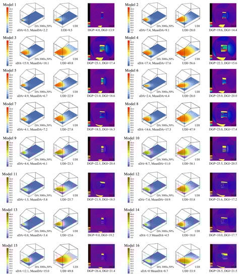 The sDA, UDI, and DGP obtained from the daylighting simulation of Room 4 in the orthogonal model of 16 quadrangular Huizhou dwellings were compiled and plotted in Figure 10. In Model 4, in Figure 10, Room 4’s sDA and UDI both attained their maximum values of 18.5% and 59.1%, respectively, showing that the room had a higher percentage of naturally illuminated spaces and greater natural daylighting overall. While Room 4 in Model 1 had the lowest natural daylighting with a sDA of 0.5% and a minimum mean of 2.2%, it was clear that all four parameters had an impact on the room’s daylighting performance. In contrast, Model 16’s DGP (26.5%) is the highest among the 16 models, which is lower than the value of 35% (Upper limit of imperceptible glare threshold). It means that the glare of all Huizhou dwellings is imperceptible glare.