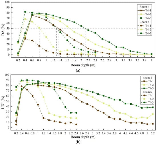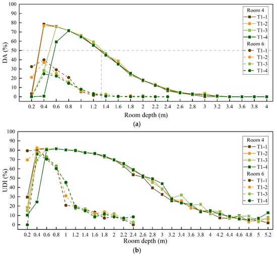 In this study, four groups of models T1-1 to T1-4 were created to investigate the effect of window edge height on the daylighting performance of rooms in Huizhou dwellings. The relevant parameters were obtained by simulating and analyzing the room daylighting performance of these models, as shown in Figure 11. The changes in DA and UDI inside the room as the room depth changes are depicted in Figure 11a,b. Rooms 4 and 6 were chosen for investigation in this study to assess the impact of room location on daylighting performance.
