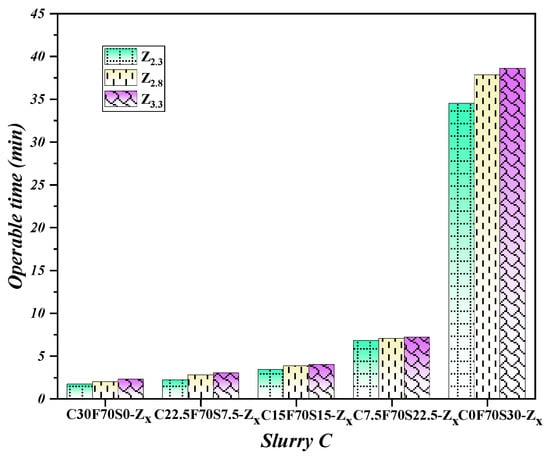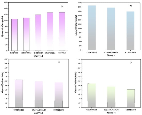The influence of the raw material composition on the operable time of slurry A was further studied by changing the proportions of fly ash and slag, while the mass percentage of cement in the cementing material was fixed (2.5%, 7.5%, and 22.5%). The experimental results are shown in Figure 2b–d, respectively. When the content of fly ash was constant, the operable time of slurry A decreased with the increase in the slag replacement. When the cement content was 2.5%, the operable time of the C2.5F27.5S70 group was reduced by 13.5% compared to the C2.5F70S27.5 group (Figure 2b). When the cement content was 7.5%, the operable time of the C7.5F22.5S70 group was reduced by 9.5% compared to the C7.5F70S22.5 group (Figure 2c). When the cement content was 22.5%, the operable time of the C22.5F7.5S70 group was 24.8% lower than that of the C22.5F70S7.5 group (Figure 2d). This might be a result of the Ca(OH)2, produced by cement hydration, providing the alkaline environment for the secondary hydration reaction with slag and fly ash. The higher the cement content in the grout, the higher the Ca(OH)2 content of the hydration product generated, and the more favorable it will be for the reaction with slag and fly ash [,]. However, the reactivity of slag was higher than that of fly ash, so different results were produced under different alkali environments. When the fly ash content was 70%, the operable time of the C22.5F70S7.5 group was reduced by 47.3% compared to that of the C2.5F70S27.5 group. When the slag content was 70%, the operable time of the C22.5F7.5S70 group was shortened by 54.2% compared to that of the C2.5F27.5S70 group. It can be seen that the relative content of cement and the relative reactivity of supplementary cementitious materials may be the main factors affecting the operable time of slurry A.