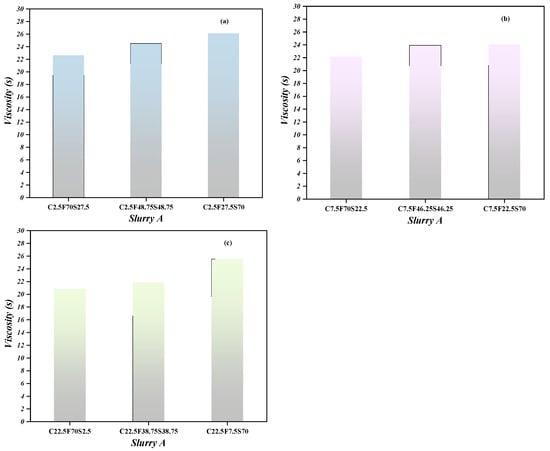 The viscosity of the slurry is an important property determining the flowability of a fluid []. The higher viscosity causes the lower flowability of the slurry. Figure 3 shows the influence of raw material composition on the viscosity of slurry A. When the cement content is fixed, the viscosity of slurry A decreased with the increase in the fly ash substituted slag content. When the cement content was 2.5%, the viscosity of the C2.5F70S27.5 group was 13.4% lower than that of the C2.5F27.5S70 group (Figure 3a). When the cement content was 7.5%, the viscosity of the C7.5F70S22.5 group was 7.9% lower than that of the C7.5F22.5S70 group (Figure 3b). When the cement content was 22.5%, the viscosity of the C22.5F70S7.5 group was 18.3% lower than that of the C22.5F7.5S70 group (Figure 3c). This may be due to the micro ball effect of fly ash in grouting material slurry A, which reduced the friction resistance caused by the relative movement of particles in the fluid and thus reduced the grouting viscosity. With 70% contents of fly ash, the slurry viscosity of the C22.5F70S7.5 group was reduced by 7.8% compared to that of the C2.5F70S27.5 group. As the slag replacement content of fly ash increased to 70%, the slurry viscosity of the C22.5F7.5S70 group was reduced by 2.3% compared to that of the C2.5F27.5S70 group. This may be attributed to the assistance that hydration products, such as C-S-H gel, produced by cement hydration, reduced the frictional resistance when the relative motion occurred between particles within the slurry. The above results indicated that the slurry viscosity of grouting material slurry A might be mainly affected by the relative content of cement, fly ash, and slag.
