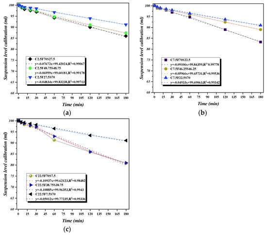 Slurry stability refers to the uniform degree of particle dispersion and suspension ability in the grouting. Figure 4 shows the influence of raw material compositions on the stability of slurry A. When the water-binder ratio was 1.0, the stability of slurry A in a 100 mL cylinder decreased with the extension of time. With the fixed cement content, the settlement rate of slurry A was shortened with the decrease in fly ash replacing slag in the system. When the cement content was 2.5%, the settlement rate of the C2.5F27.5S70 group was 37.0% lower than that of the C2.5F70S27.5 group. When the cement content was 7.5%, the settlement rate of the C7.5F22.5S70 group was 45.8% lower than that of the C7.5F70S22.5 group. However, when the cement content was 22.5%, the settlement rate of the C22.5F7.5S70 group was 54.2% lower than that of the C22.5F70S7.5 group. The above results may be related to the secondary hydration reaction between highly reactive slag and the cement hydration product Ca(OH)2 [], which reduced the settlement rate of particles in the grouting. As the fly ash content increased to 70%, the slurry settlement rate of the C2.5F70S27.5 group was reduced by 29.9% compared to that of the C22.5F70S7.5 group, but when the slag content was 70%, the grouting settlement rate of the C2.5F27.5S70 group was reduced by 3.6% compared to that of the C22.5F7.5S70 group, which may be due to the relatively high content of cement in the system and the secondary hydration products of cement hydration product Ca(OH)2, and the active powder improved the suspension capacity of particles in the grouting. Therefore, the relative content of cement and the relative reactivity of supplementary cementitious materials (fly ash and slag) cause the main factors affecting the stability of grouting material slurry A.