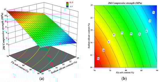 Figure 6 shows the response surface and contour of the 28-day compressive strength of the DLGM mortar under the interaction of sodium silicate content–fly ash content. By fixing the fly ash content, the 28-day compressive strength of the DLGMs mortar shows a decreasing trend with the increase in sodium silicate content (Figure 6a). With a value in the range of 10–25%, the 28-day compressive strength of the DLGM mortar increased with the decrease in fly ash content, and the variation range was large. The response surface changed most significantly when the content of sodium silicate was 10%. Based on the interaction effect of the content of sodium silicate and fly ash on the 28-day compressive strength of the DLGMs mortar, it was clear that when the content of sodium silicate and fly ash was 10–13% and 70–75% respectively, the 28-day compressive strength of the DLGMs mortar was no less than 9.0 MPa (Figure 6b) and could reach up to 11.3 MPa.