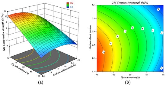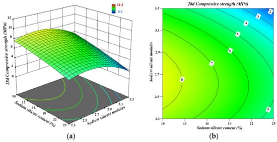 Figure 7 shows the response surface and contour of the 28-day compressive strength of the DLGM mortar under the interaction of sodium silicate modulus–fly ash content. When the content of fly ash was fixed, the 28-day compressive strength of the DLGM mortar increased first and then decreased with the increase in the sodium silicate modulus. When the sodium silicate modulus was within the range of 2.3 to 2.6, keeping the constant modulus value, the 28-day compressive strength of the DLGM mortar decreased with the increase in fly ash content. According to the variance analysis of the second-order response surface model (Table 7), it can be seen that the interaction between the sodium silicate content and the sodium silicate modulus has a powerful influence on the strength of the DLGMs mortar (p-value ≤ 0.01). Through the interaction of the sodium silicate modulus and fly ash content, it is clear that to ensure that the 28-day compressive strength of the DLGM mortar was higher than 10.0 MPa; the sodium silicate modulus must be kept within the range of 2.3–2.7, and the fly ash content should be lower than 72% (Figure 7b).