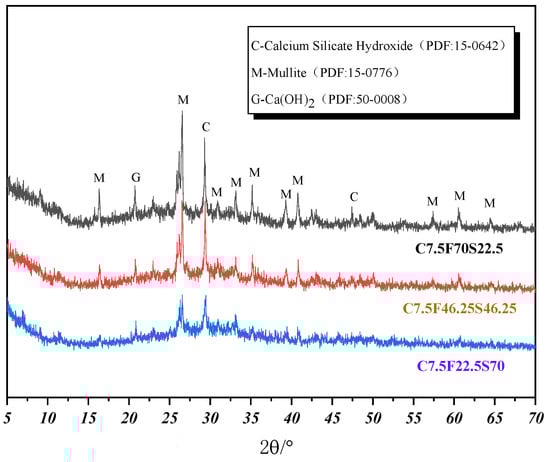 Figure 9 shows the XRD patterns of slurry A at the age of 28 days. The characteristic peak intensity of cement hydration product Ca(OH)2 decreased with the increase in the amount of slag. The results showed that the reactivity of slag was higher, which led to a large consumption of Ca(OH)2 generated from the cement hydration [,,]. Figure 10 shows the XRD patterns of hardened slurry C, prepared with different sodium silicate moduli at the age of 28 days. By changing the sodium silicate modulus, the characteristic peak intensity of Ca(OH)2 was significantly reduced, and amorphous peaks appeared in the range of 20–35°, which might be due to the formation of C-S-H gel in the system. The amorphous peak in the XRD pattern became more visible with the decrease in sodium silicate modulus. The lower modulus of sodium silicate was more conducive to activate the potential reactivity of slag and fly ash, thus promoting the formation of more amorphous substances and easily improving the compressive strength of the DLGM mortar [].