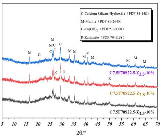 - After mixing different moduli of sodium silicate into the C7.5F70S22.5 group, the characteristic peak intensity of the Ca(OH)2 revealed a significant reduction, and a broader amorphous peak appeared in the range of 20° to 35°. With the decrease in the sodium silicate modulus, the amorphous peak became more obvious, indicating that amorphous phases were produced in the system. The SEM results showed that the microstructure of the C7.5F70S22.5-Z2.3 and the C7.5F70S22.5-Z2.8 groups was denser than that of the C7.5F70S22.5-Z3.3 groups. Compared to the C7.5F70S22.5-Z2.3 group, the distribution of the reaction products in the C7.5F70S22.5-Z2.8 group was more uniform.
