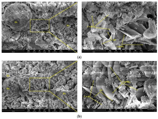 Figure 11 shows the SEM images of the C7.5F70S22.5 and the C22.5F70S7.5 groups after 28 days of curing. It can be found that there were both geopolymer gel and crystalline hydration products, as well as a few small needle-like crystals. The surface of the fly ash particles suffered uneven corrosion. Compared to the C7.5F70S22.5 group, the C22.5F70S7.5 group contained more flocculated C-S-H gel and hexagonal plate Ca(OH)2 crystals. Figure 12 shows the SEM images of the DLGMs pastes prepared with different sodium silicate moduli at the age of 28 days. After adding sodium silicate to slurry A, the hydration reaction of the cement and the alkali activation reaction would be carried out simultaneously. The C7.5F70S22.5-Z3.3 group had more microcracks, while the C7.5F70S22.5-Z2.3 group and the C7.5F70S22.5-Z2.8 group were denser than the C7.5F70S22.5-Z3.3 group. Compared to the C7.5F70S22.5-Z2.3 group, the distribution of the reaction products was more uniform in the C7.5F70S22.5-Z2.8 group.