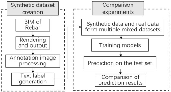The processes for making a synthetic image dataset for rebar and comparing the performance of the datasets are shown in Figure 1.