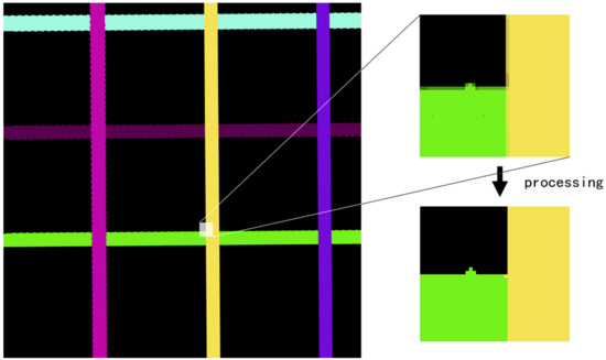 Step 2: Merging the transition color with the annotation color. First, the pixel points whose values are neither the annotation color nor black are filtered; these are called transition color pixel points. Then, the “color distance” between the RGB color value of each transition color pixel point (the value range of each channel is 0–255) and the color value of each annotation color is calculated using formula (1), and the color value of the transition color pixel point is transformed into the annotation color with the smallest color distance.