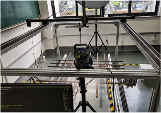 Real photographs of the rebar mesh were taken in an indoor laboratory environment using a Cognex CAM-CIC-12MR-8-GC industrial camera with an 8 mm-focal-length lens and a pixel resolution of 1006 × 759. Photographs were taken of rebar meshes consisting of 16 mm rebar with 20 mm rebar, and 20 mm rebar with 25 mm rebar, with a spacing of 150 mm to 200 mm. The rebar net was placed parallel to the ground on a rebar support frame, and the camera was installed on a motorized slider module on the rebar support frame with its axial direction perpendicular to the rebar net. The module moved the camera in three directions: front-to-back, left-to-right, and up-and-down. The shooting distance was 50 to 80 cm, with about 6 to 10 rebar pieces in the field of view. A total of 1500 shots were collected, of which 300 were taken with the light turned on. The location of the rebar was changed randomly or the rebar was rotated along the longitudinal axis, and the lighting conditions in the room were changed frequently by adjusting the blinds to enhance the diversity and generalization of the dataset during the shooting process. The image acquisition site is shown in Figure 11.