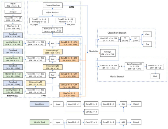 The sketch architecture of the Mask R-CNN network is shown in Figure 12. This network is based on Faster R-CNN [20] with a Mask prediction branch added, and the ROI Pooling layer of the original network was replaced with the ROI Align layer to achieve more accurate prediction. This algorithm has the functions of both object detection and instance segmentation. The detailed architecture of the Mask R-CNN network used in this paper is shown in Figure 13, for which we used ResNet-101-FPN as the backbone to execute the single classification instance segmentation task.
