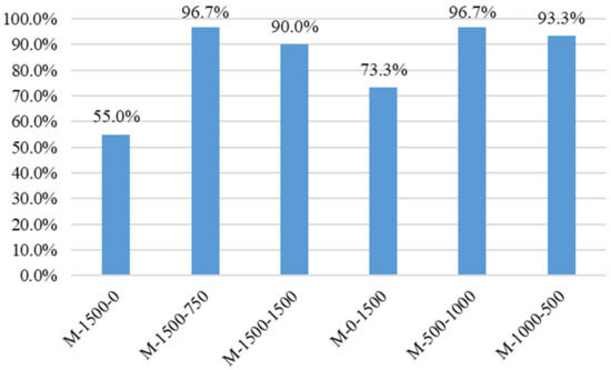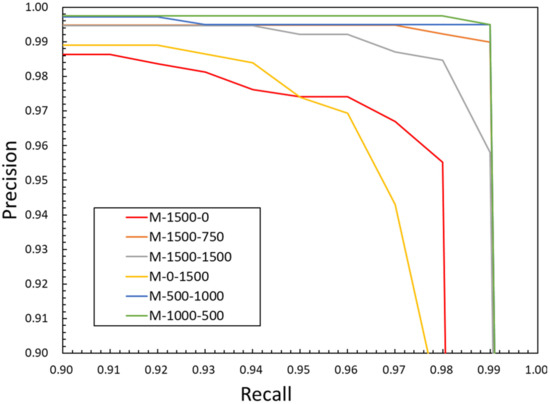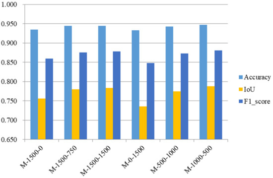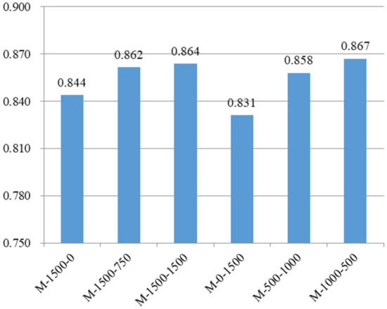 As can be seen in Figure 17, the recognition accuracy values of each model were compared with each other, and the trend was basically consistent with the previous evaluation metrics comparison (M-1500-750 and M-1500-1500 had better predictions results than M-1500-0, and M-500-1000 and M-1000-500 had better predictions results than M-1500-0 and M-0-1500), reflecting the reasonableness and effectiveness of using synthetic data to train the model.