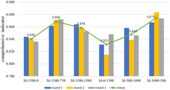 Figure 18 and Figure 19 show that the trends obtained from the three experiments were basically the same (M-1500-750 and M-1500-1500 had a better prediction accuracy than M-1500-0, and M-500-1000 and M-1000-500 had a better prediction accuracy than M-1500-0 and M-0-1500), reflecting the rationality and effectiveness of using synthetic data to train the model. This also proves the stability of the test results and strengthens their credibility. The reason for using the arithmetic mean of the results of the three repeated tests is that the mean value of the same metric was taken at this time. Moreover, there is no significant difference between the range of values of the same metric and the dispersion of the data in the same model in the repeated tests, and the difference between the harmonic mean and the arithmetic mean is small.
