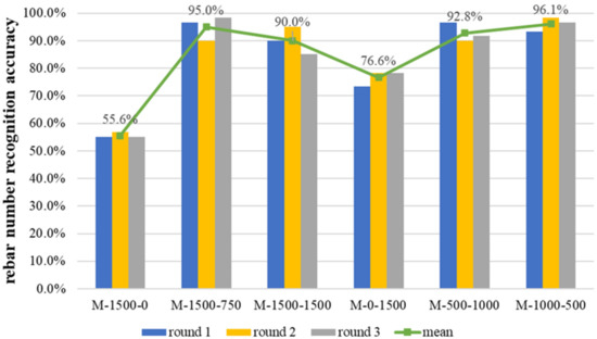 In order to verify the stability and credibility of the test results, the abovementioned test process was repeated twice, and the pictures in each training set were randomly selected each time. The model was trained with the same training parameters and tested using the same test set. The evaluation metrics of the three experiments are shown in Figure 18, and the comprehensive metric was used for evaluation. The rebar number recognition accuracy of the three trials is shown in Figure 19.