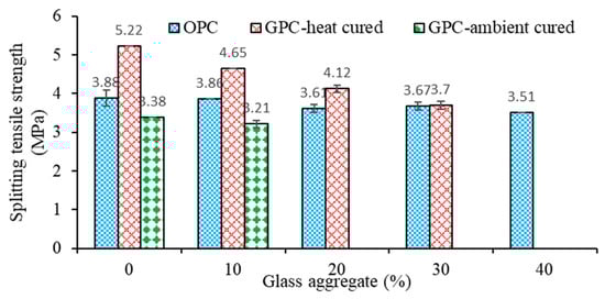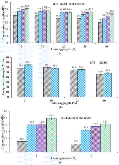 - In general, the compressive and tensile strength of the OPC and geopolymer concretes decreased due to the increase in the glass aggregate. The OPC concrete mixtures with a 0, 10, 20, 30 and 40% recycled glass coarse aggregate provided a 28-day compressive strength of 46.7, 46.6, 45.3, 41.9 and 36.9 MPa, respectively. The decrease in the strength due to the use of a glass coarse aggregate was ascribed to the smooth surface of the glass aggregate that produced a poor bond with the binder matrix.