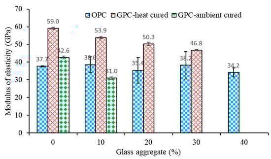 - The modulus of elasticity of the geopolymer concrete decreased due to the increase in the glass aggregate. On the other hand, the modulus of elasticity of the OPC concrete varied between 34.2 and 38.6 GPa, and there was no certain trend for the increase in the glass aggregate. Furthermore, for the same glass content, a higher modulus of elasticity was found in the heat-cured geopolymer concrete compared to the OPC and ambient geopolymer concretes.